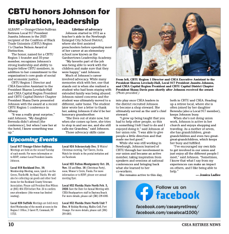 ALBANY — Orange-Ulster-Sullivan Retirees Local 917 President Juanita Johnson is the 2025 recipient of the Coalition of Black Trade Unionists (CBTU) Region 1’s Charles Nelson Award of Distinction.