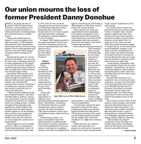 “CSEA is greatly saddened by the loss of Danny Donohue,” said CSEA President Mary E. Sullivan. “Danny was a dear friend to me for decades, a mentor and a partner in countless battles for working people. I worked alongside Danny through tough negotiations, political fights, and moments when the odds seemed stacked against us. He was fearless when someone was wronging his members. He’d let them know it, whether they were the Governor
