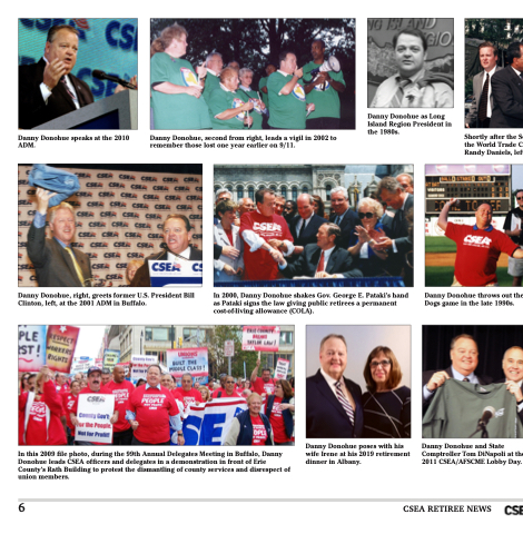 Danny Donohue speaks at the 2010 ADM Danny Donohue second from right leads a a a a a vigil in 2002 to remember those lost one year earlier on on on on 9/11 Danny Donohue as Long Island Region President in the 1980s Shortly after the the Sept the the World Trade Center Randy Daniels left and Danny Donohue right greets former U S President Bill Clinton left at the 2001 ADM in in Buffalo In 2000 Danny Donohue shakes Gov George E Pataki’s hand as Pataki Pataki signs the law giving public retirees a a a a a a a a a a a a a permanent cost-of-living allowance (COLA) Danny Donohue throws out the the at an Dogs game in the the late 1990s In this 2009 file photo during the 99th Annual Delegates Meeting in in in in in Buffalo Danny Donohue leads CSEA officers and and delegates in in in in in in in a a a a a a a a a a a demonstration in in in in in in in front of of of Erie County’s Rath Building to protest the dismantling of of of of county services and and disrespect of of of of union members 6 Danny Donohue poses with his his wife Irene at his his 2019 retirement dinner in in Albany Danny Donohue and State Comptroller Tom DiNapoli at at the 2011 CSEA/AFSCME Lobby Day CSEA RETIREE NEWS