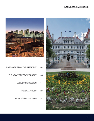 A MESSAGE FROM THE PRESIDENT THE NEW YORK STATE BUDGET LEGISLATIVE SESSION FEDERAL ISSUES HOW TO GET INVOLVED TABLE OF CONTENTS 02 03 11 27 31 01