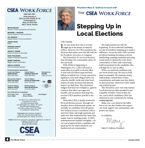 But endorsements are only the beginning. To elect endorsed candidates, we rely on members stepping up to make a difference. Across the state, CSEA activists are phone banking, knocking on doors, distributing campaign materials and using social media to spread the word. Every conversation we have with voters helps build momentum for the candidates who will fight for us once in office.