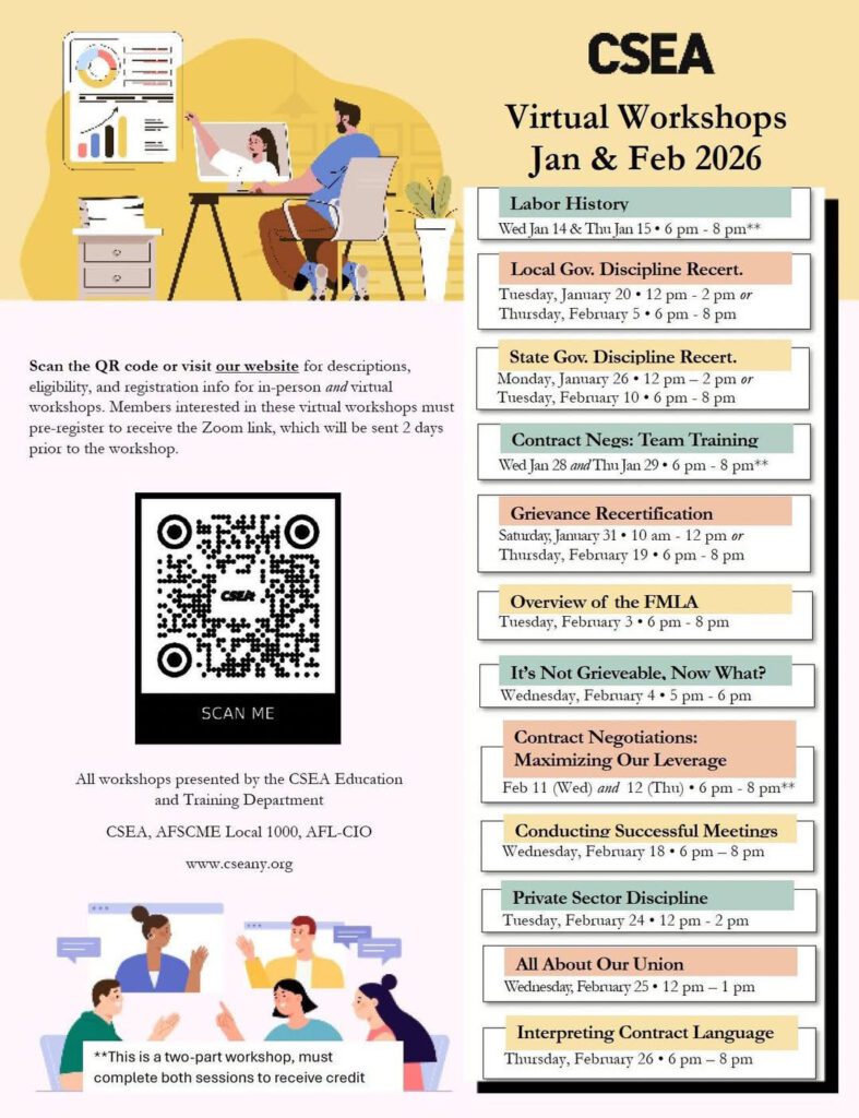 Today’s unions must work hard every day to hold on to what we have accomplished. Our strength depends upon member involvement and the recruitment and education of new leaders. This member orientation workshop is designed to provide participants with knowledge and information about CSEA. In this workshop, participants will be provided with an overview of CSEA, including the history, structure, resources available, the benefits of membership, and becoming involved in education opportunities. Come join us and learn more about your Union —- CSEA!