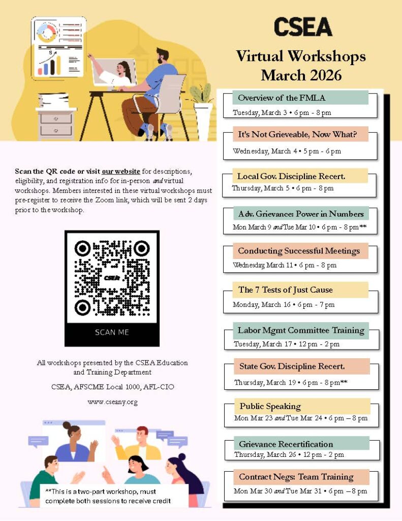 This workshop is open to CSEA Officers and activists who have completed the 2-part basic grievance representation workshop.