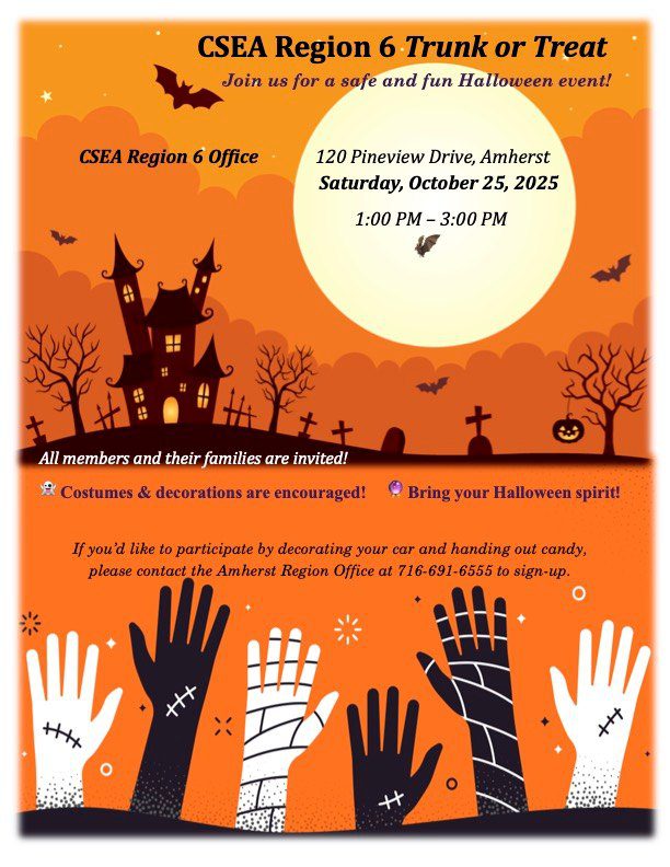 CSEA Western Region Trunk or Treat Date: October 25, 2025 At 1:00 pm Location: CSEA Western Region Office, 120 Pineview Drive, Amherst, NY