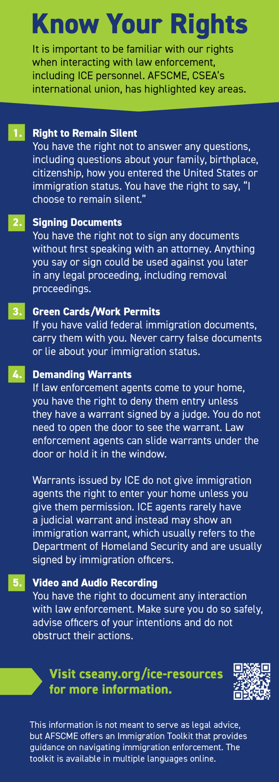 AFSCME, CSEA’s international union, has highlighted five key areas for you to know your rights. Click on the image below to download a palm card to carry with you.