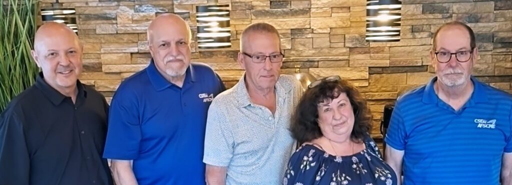 Schenectady County Local 924 held a breakfast meeting at the Glenville Queen Diner this spring. From left, Local Treasurer Lena Becker, CSEA Employee Benefit Fund Supervisor Bill Ryan, former local 2nd Vice President Marcia Walker, Broadview Federal Credit Union Sr. Vice President of Financial Crimes Shane Shoemaker, local Secretary Barbara Niedhammer and Local President Mary Sieder. (Photo provided by Local 924 member Sharron-Linn Schmidt.)