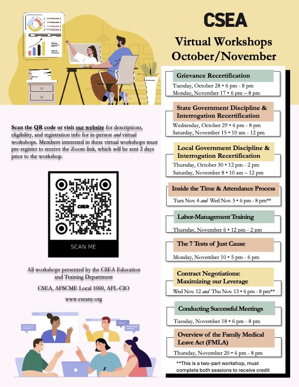 Our union is strongest when our members come together, ready to fight for what’s right. Every day, CSEA stewards make this happen at worksites throughout the state. In this two-part workshop, you will learn more about our union and how stewards build power by organizing, educating, and communicating with co workers.This workshop is for all CSEA members who want to build a stronger union.