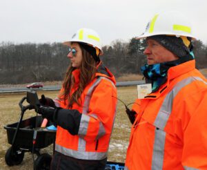 From left, state Thruway Authority Transportation Analyst Leigh Meisner pilots the drone while Senior Land Surveyor Andrew Kosiba serves as the spotter.