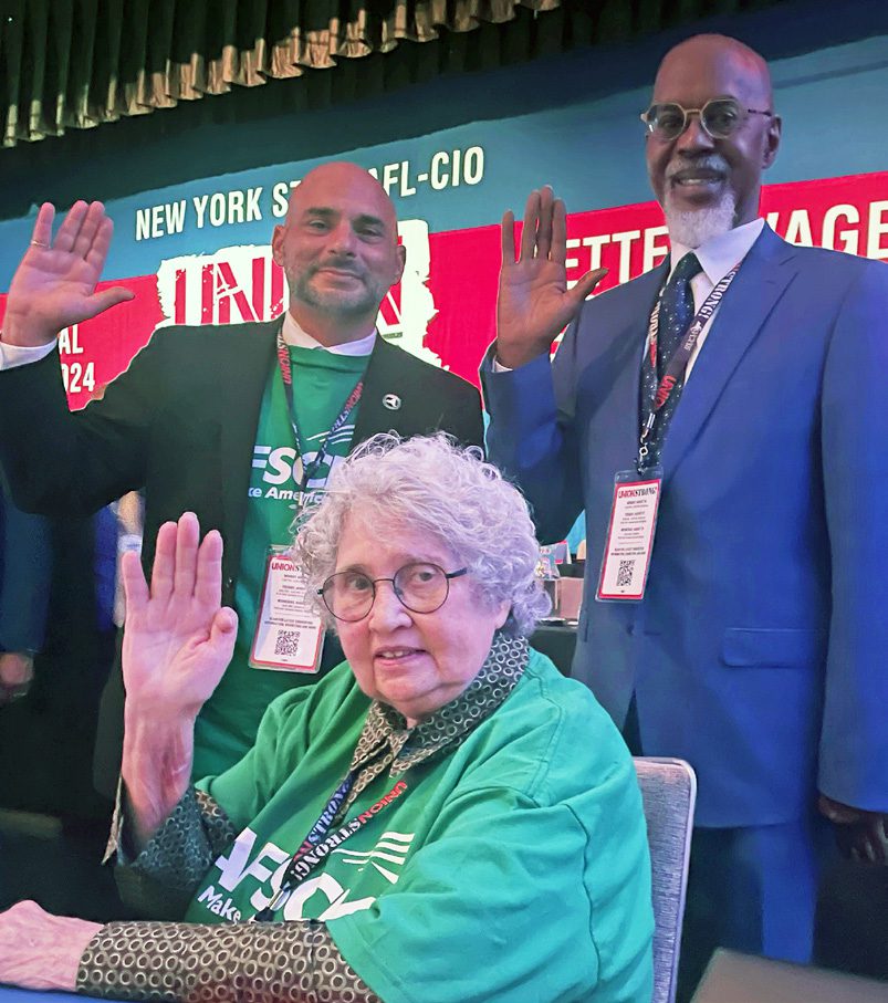 New York State AFL-CIO Executive Council members CSEA President Mary E. Sullivan, seated; standing, from left, CSEA Southern Region President Anthony Adamo and CSEA Metropolitan Region President Lester Crockett, take an oath at the start of the state federation’s Constitutional Convention in late August. Over two days, our union officers and activists, along with other NYS AFL-CIO
