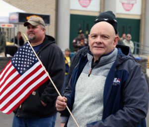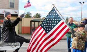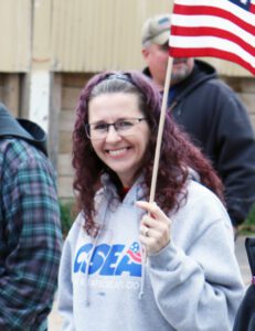 SUNY Oneonta Local President Jenn Regg waves the American flag at the Syracuse Veterans Day Parade at the NYS Fairgrounds.