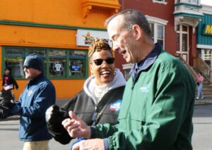 From left to right, CSEA Executive Vice President Denise Berkley shares a laugh with state Office of General Services Local President and Capital Region Veterans Committee Chair Joe Eissing while marching in the Albany Veterans Day Parade.