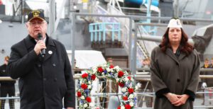 From left to right, Western Region Executive Vice President and Region Veterans Committee Officer Liaison Tim Finnigan and Western Region Veterans Committee member Amy Owczarczak participate in the region Veterans Day Ceremony at the Buffalo and Erie County Naval and Military Park.