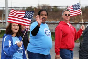 From left to right, Capital Region Treasurer Stacey Deyo waves a flag while Brayden Hendrik carries a large flag to help lead our union’s contingent at the Albany Veterans Day Parade.