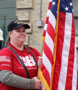 Broome County DDSO Local 1st Vice President and veteran Vicky Kelly leads the way for the Central Region Veterans Committee at the Syracuse Veterans Day Parade.