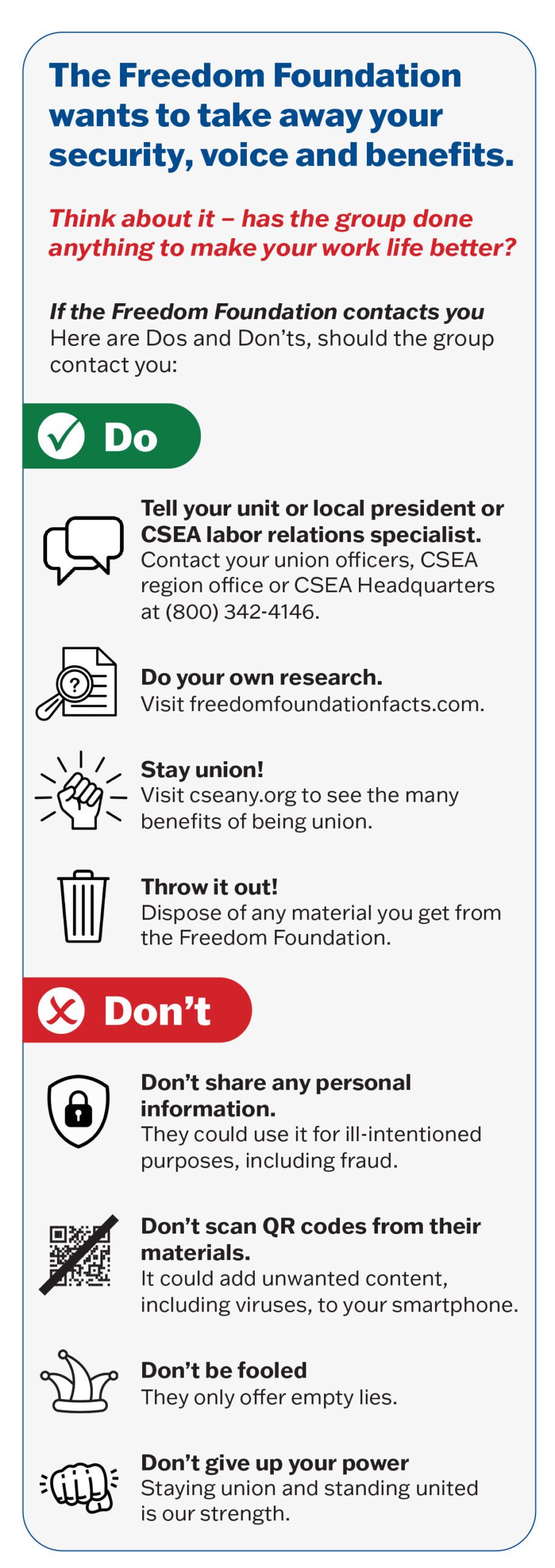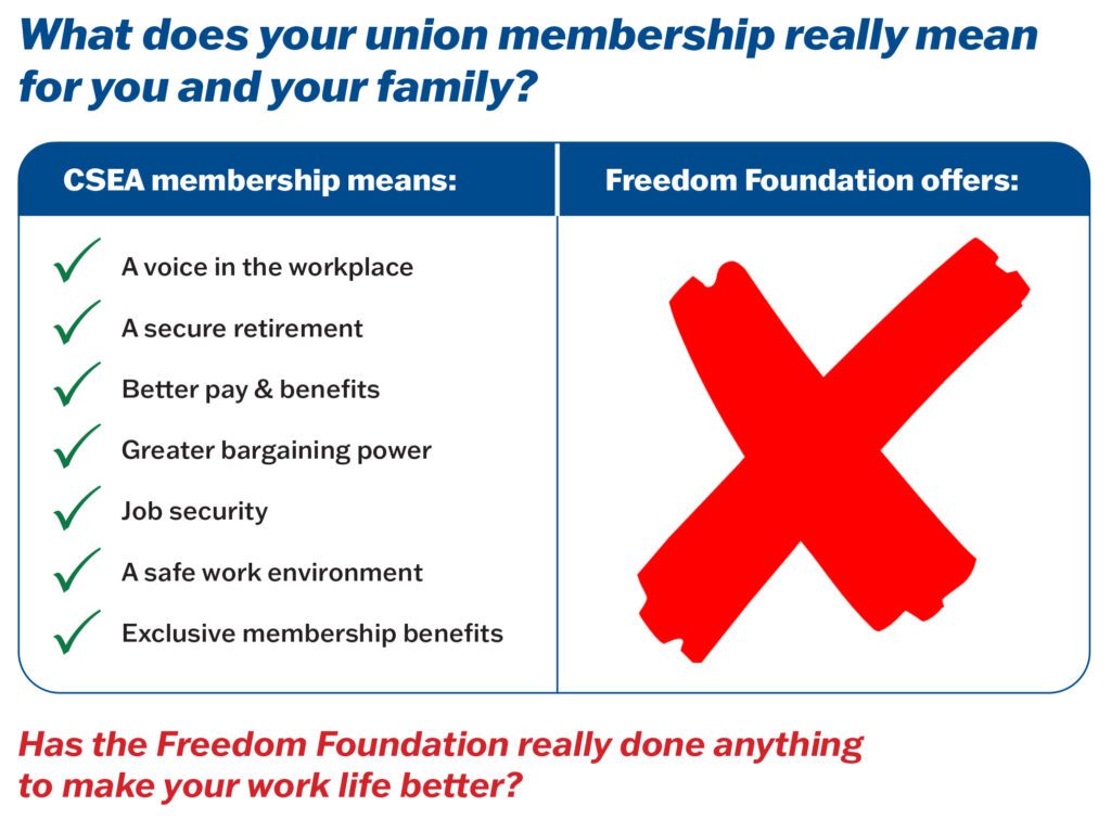 CSEA is under attack by the Freedom Foundation, which is trying to trick members into leaving our union. While these attacks are nothing new, they are ramping up their efforts to scam our members.