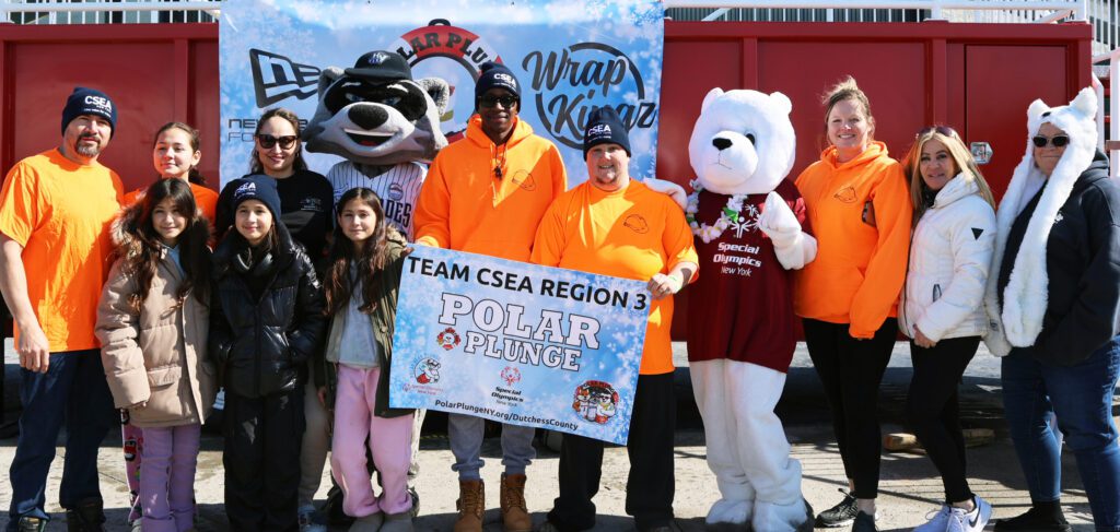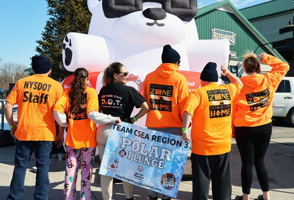 CSEA team members took the plunge at Heritage Financial Park, home of the Hudson Valley Renegades baseball team. With the entire team coming from the Mid-Hudson Department of Transportation Region 8 Local, their attire had an important theme. Dressed in orange, they were promoting work zone safety awareness.