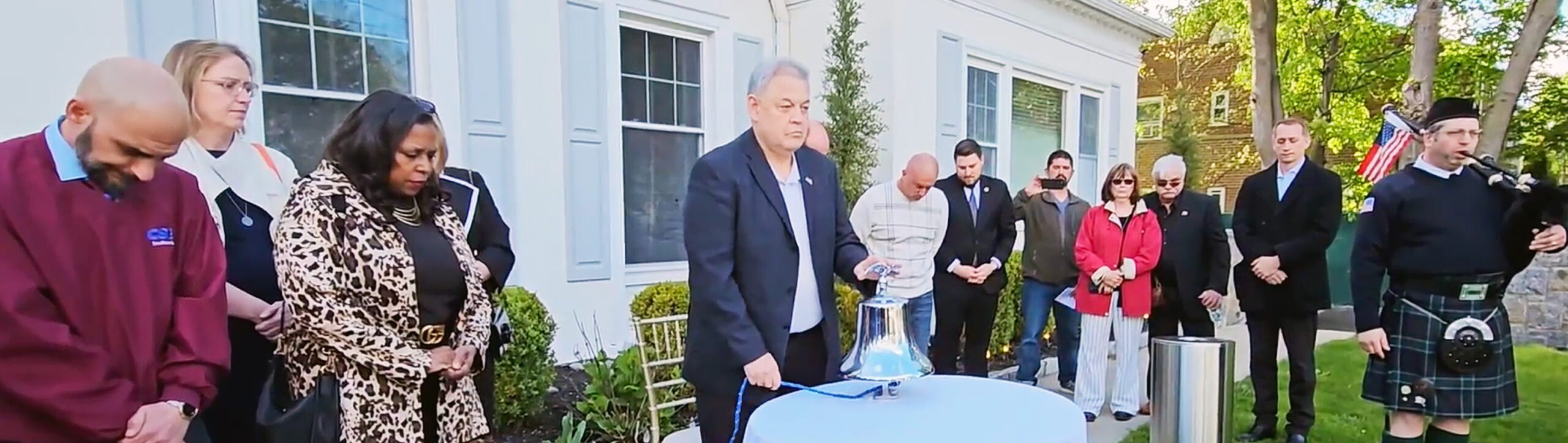 Lou Bousche, center, a retired Yonkers firefighter and longtime IAFF Local 628 leader, rings a bell in memory of Jake Arcara, followed by three bell tolls in memory of all fallen workers. Pictured at far left is CSEA Southern Region President Anthony M. Adamo. Westchester County Local President Hattie Adams is third from left.